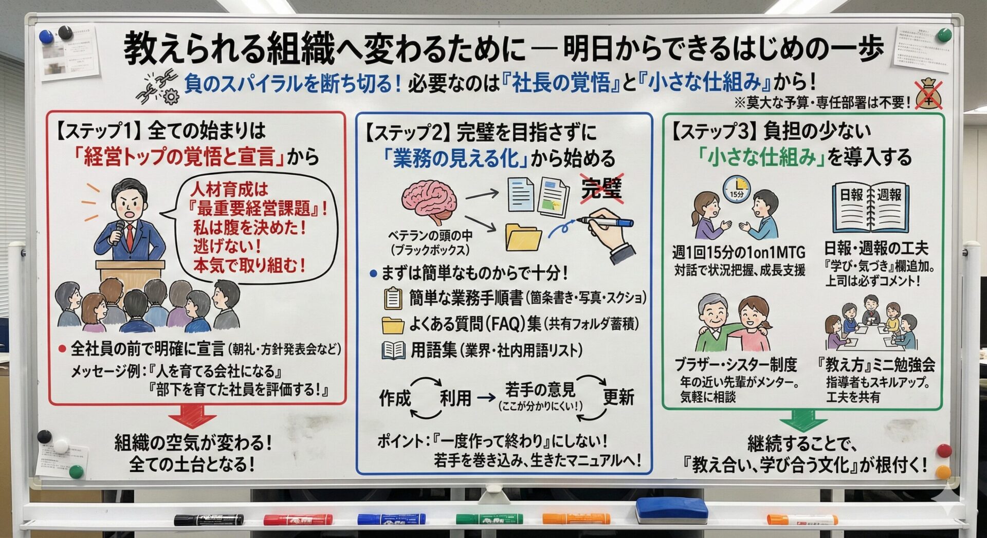では、どうすればこの負のスパイラルを断ち切り、「教えられる組織」へと変革できるのでしょうか?莫大な予算や専任の部署など必要ありません。重要なのは、社長の覚悟と、「小さな仕組み」から始めることです。