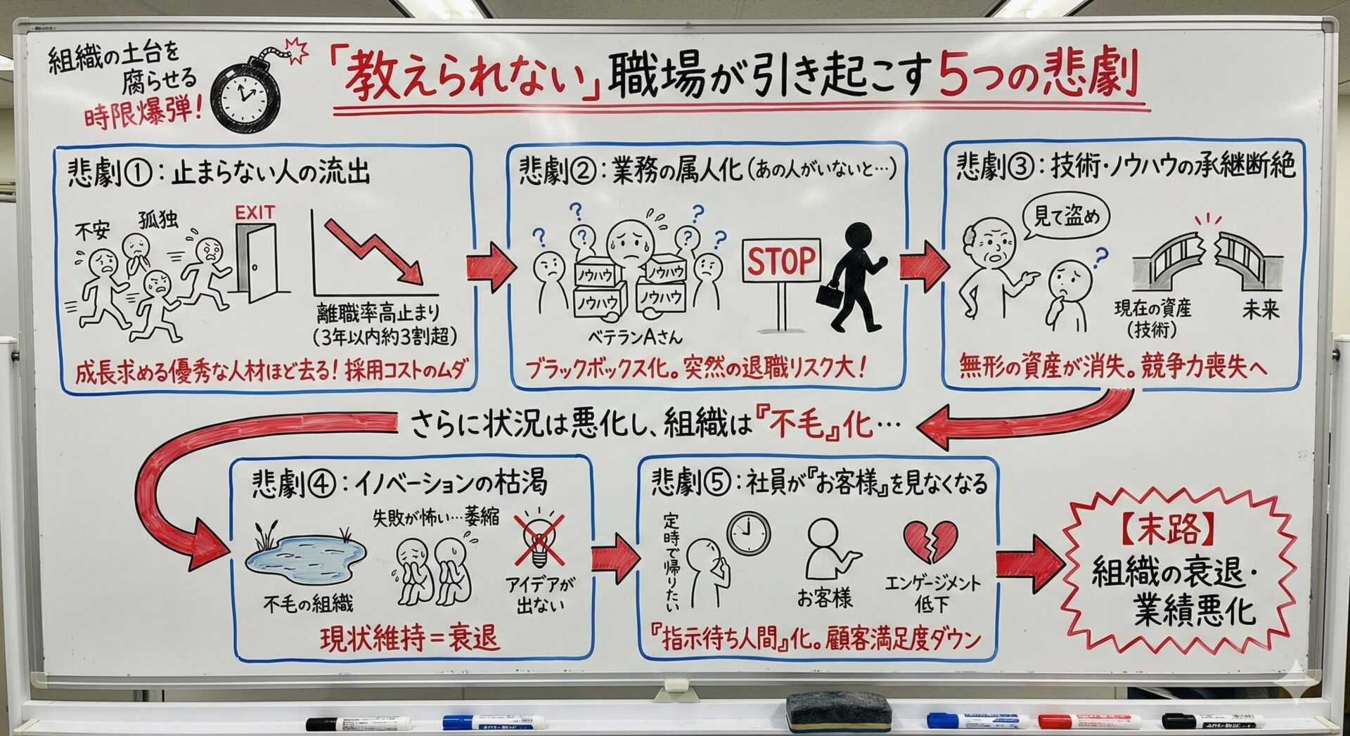 本コラムでは、なぜ「教えられない」職場が危険なのか、その先に待ち受ける悲惨な末路とは何かを、私が現場で見てきた生々しい事例と客観的なデータを交えながら徹底的に解説します。そして、明日からでも始められる具体的な処方箋を提示します。