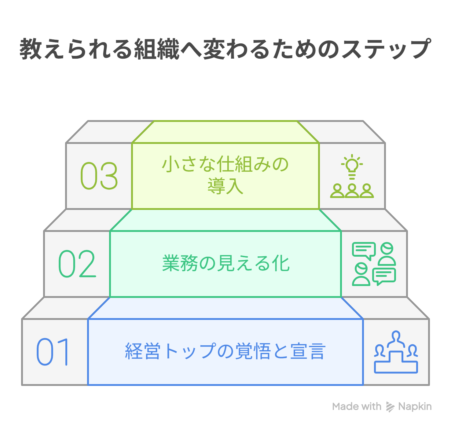 では、どうすればこの負のスパイラルを断ち切り、「教えられる組織」へと変革できるのでしょうか?莫大な予算や専任の部署など必要ありません。重要なのは、社長の覚悟と、「小さな仕組み」から始めることです。
