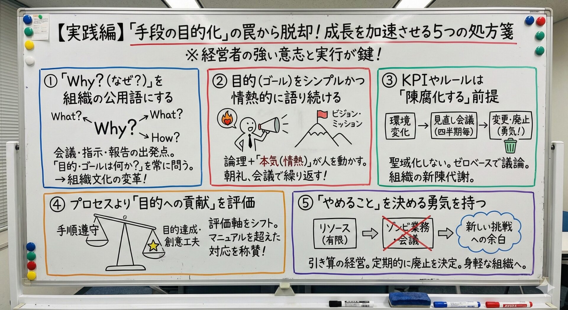 では、どうすればこの「手段の目的化」という根深い病から脱却できるのでしょうか?特効薬はありませんが、組織の体質を根本から改善する確実な処方箋は存在します。経営者であるあなた自身が、強い意志を持って実行することが何よりも重要です。