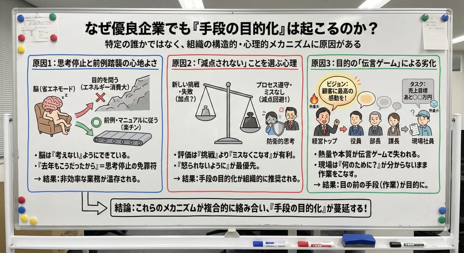 では、なぜこれほどまでに多くの組織で「手段の目的化」が蔓延してしまうのでしょうか?それは特定の誰かが悪いわけではなく、組織が持つ構造的・心理的なメカニズムに原因があります。