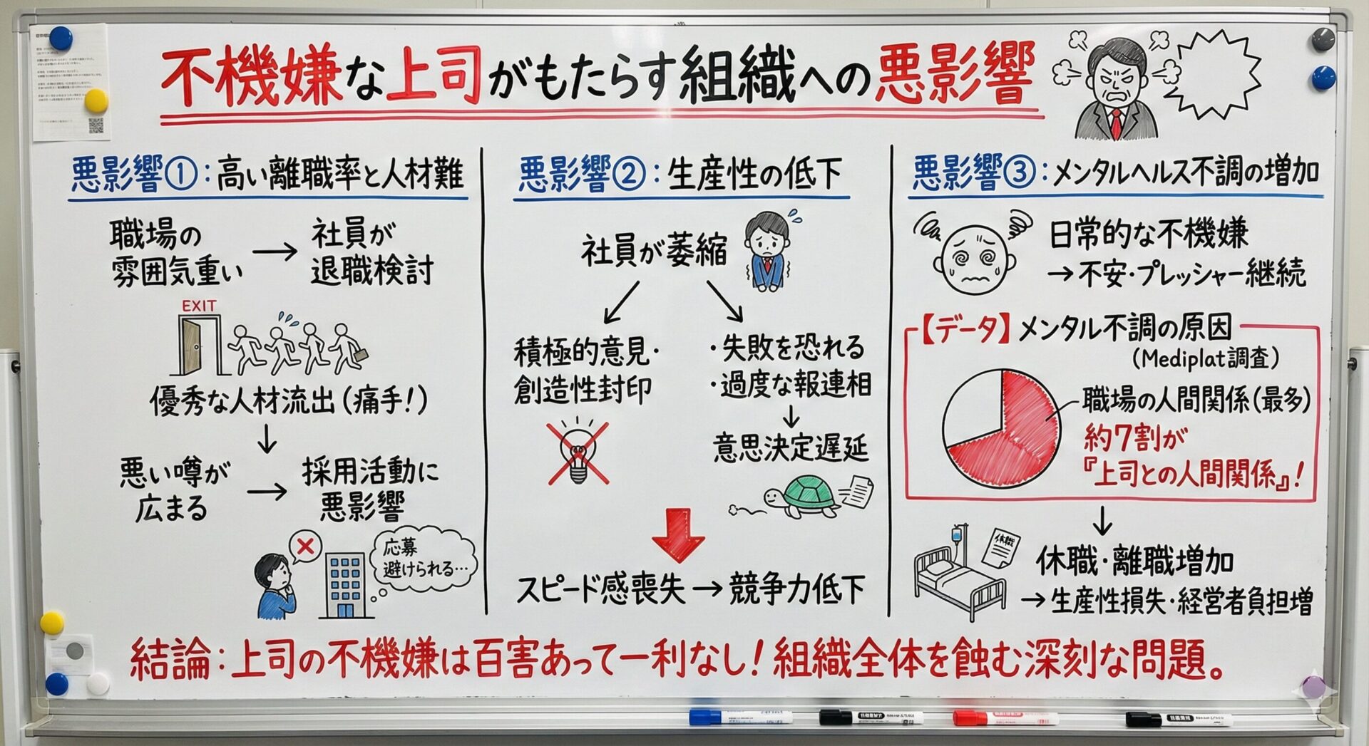 上司の機嫌が職場全体に暗い影を落とす状況は、企業にとって非常に大きなリスクです。中堅・中小企業においては、経営者や幹部、管理職が複数いるとはいえ、大企業ほどのクッションがなく、社員1人ひとりの存在感が際立ちます。不機嫌な上司1人が常に不安定な状態であるだけで、組織全体の風土が悪化する可能性は高いのです。