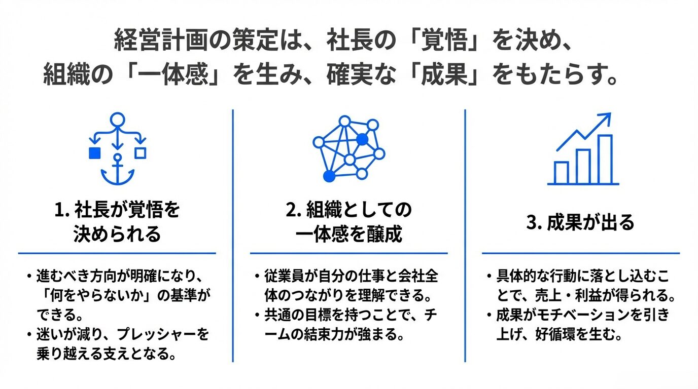 経営計画を策定することは、経営者や企業全体にとって大きなメリットをもたらします。ここでは、特に重要な3つのポイントを解説します。