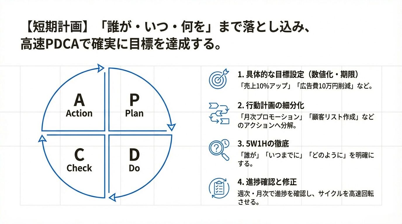 - 特徴: 1年以内、もしくは四半期単位など比較的短期間の目標や行動計画を示すもの