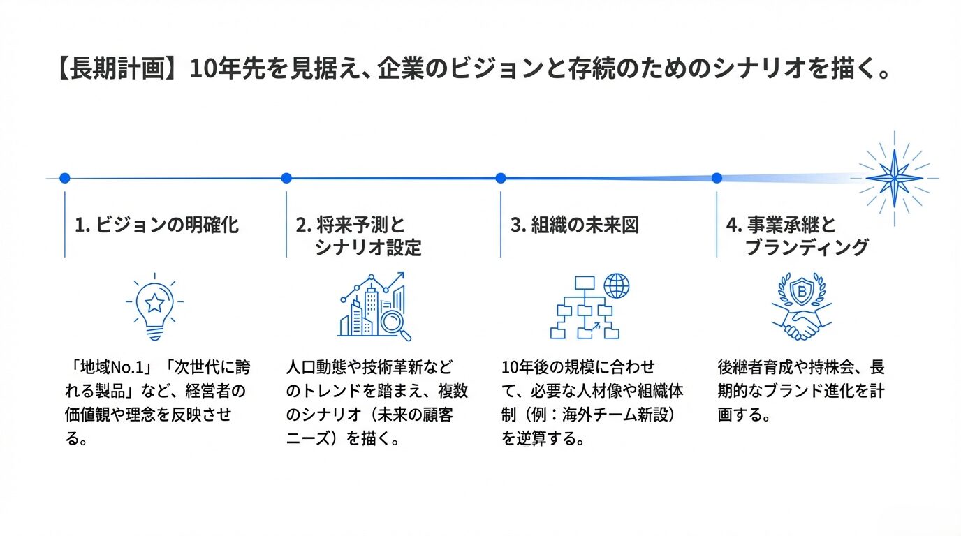 - 特徴: 10年以上のスパン、あるいは次世代への事業承継まで見据えた企業ビジョン