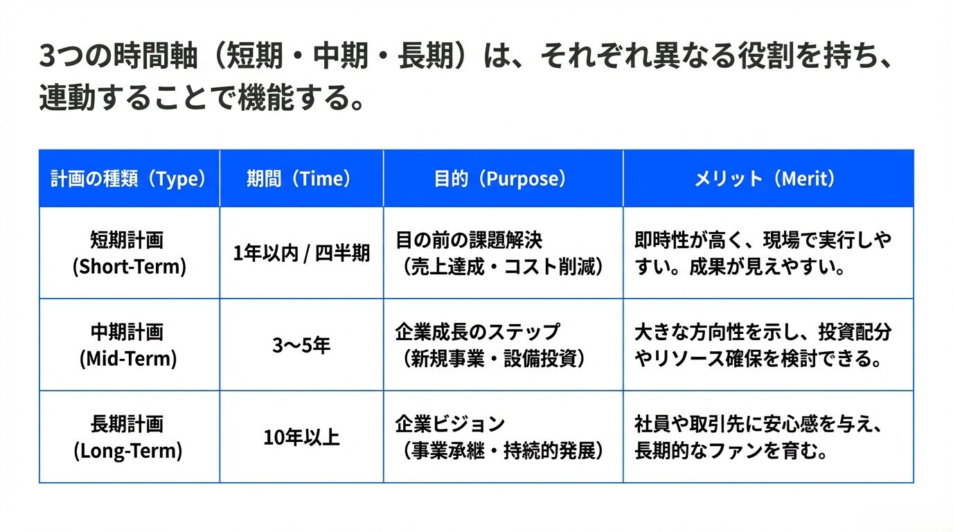 経営計画は、会社の未来を切り開くための道標であり、短期・中期・長期の計画が互いに連動することで、その効果を最大限に発揮します。