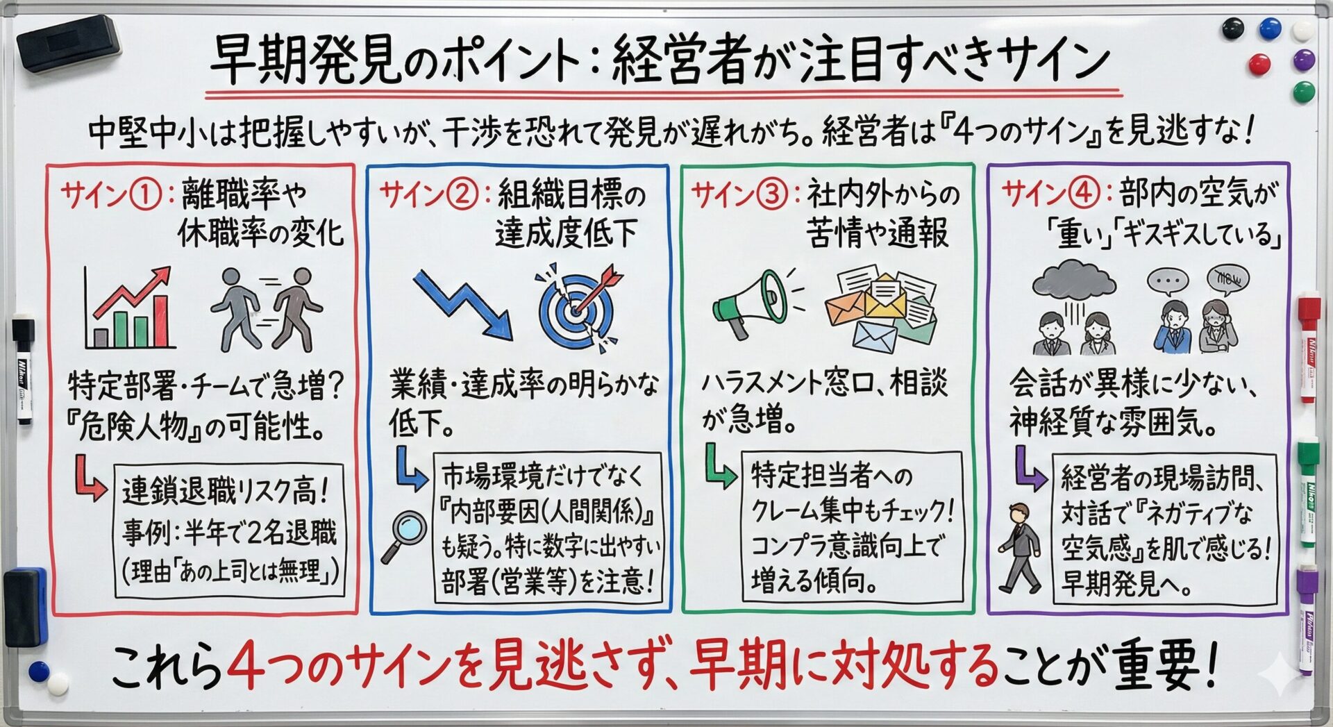 経営者が現場を訪問した際に、社員同士の会話が異様に少なかったり、誰かが話すたびに周囲が神経質になっている雰囲気を感じるといったネガティブな空気感がある場合には注意が必要です。経営者自身が定期的に現場を回り、社員と面談や雑談をするなど、密なコミュニケーションを図ることで、問題の早期発見につなげることができます。