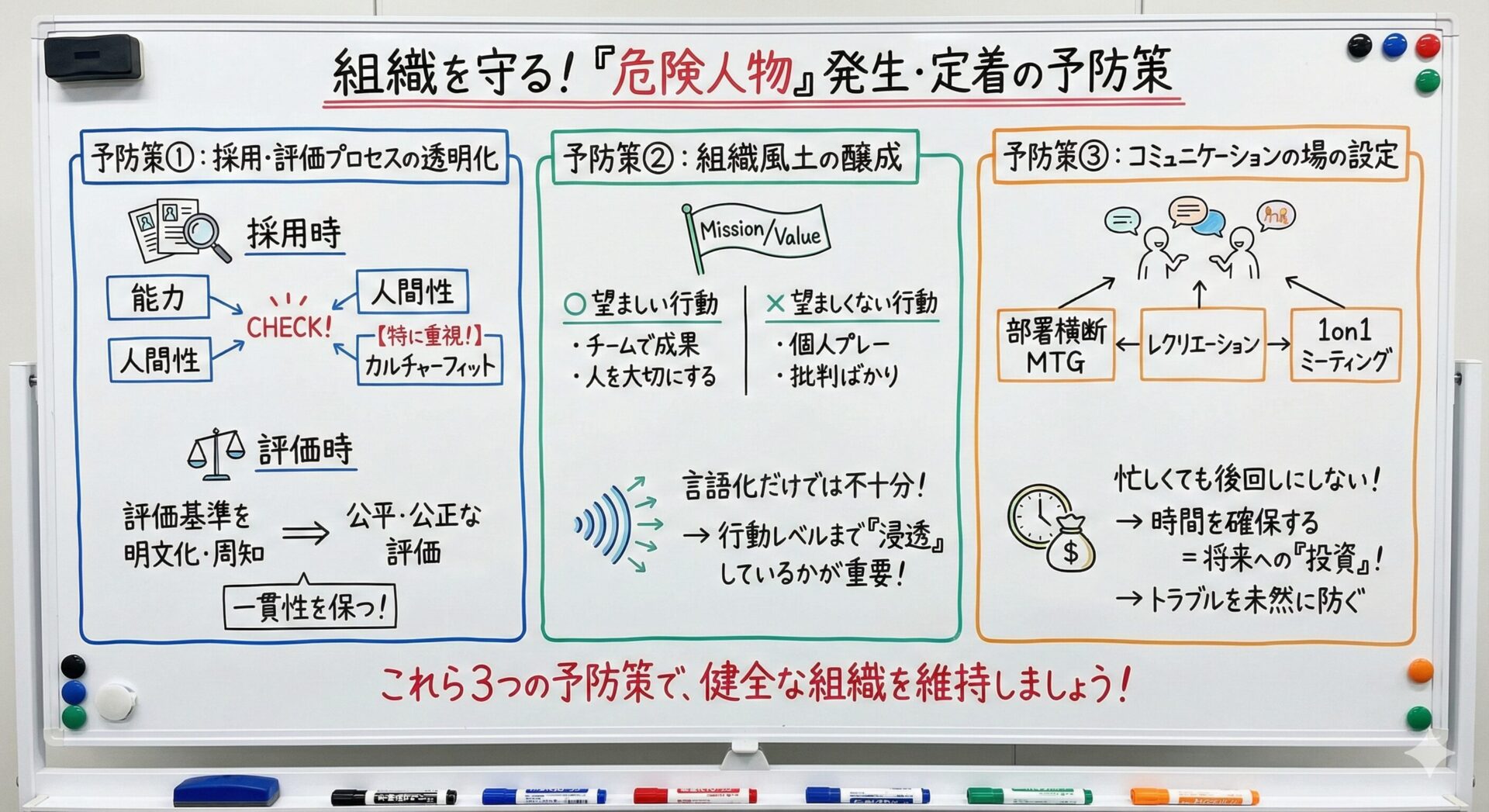 従業員数がそれほど多くない中堅中小企業にとっては、一人ひとりの社員が会社の将来を左右するほど大きな存在となり得ます。その中で、組織文化やチームワークを破壊しかねない「危険人物」の影響力は、非常に大きくなる可能性があります。優秀な社員の離職、顧客や取引先のクレーム、さらには組織の士気低下による業績悪化など、想定されるリスクは多岐にわたります。だからこそ、経営者としては「予防策」と「事後対応」の両面をしっかりと整備し、「危険人物」を生まない・放置しない仕組みを作らなければなりません。具体的には、採用段階から価値観の合う人材を見極め、評価制度や組織風土を「人を大切にする仕組み」に設計することがポイントです。また、万が一社内に「危険人物」が現れた場合は、事実確認を徹底したうえで早期に対応を行い、組織に与える悪影響を最小限に抑えなければなりません。