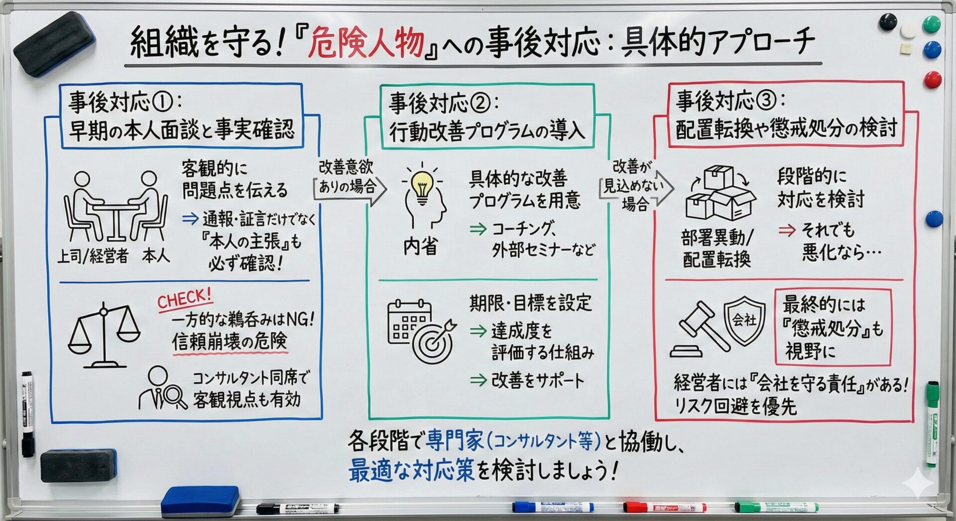 当事務所のクライアントで危険人物と思しき社員が発生した場合は、経営者や上司とともにコンサルタントである私もその人物との面談に同席し、事実関係を整理するとともに、客観的視点から助言をさせていただいています。