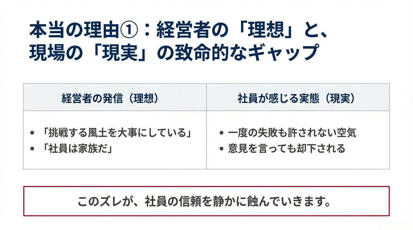 本当の理由①:経営者と社員の価値観ギャップを埋める努力不足