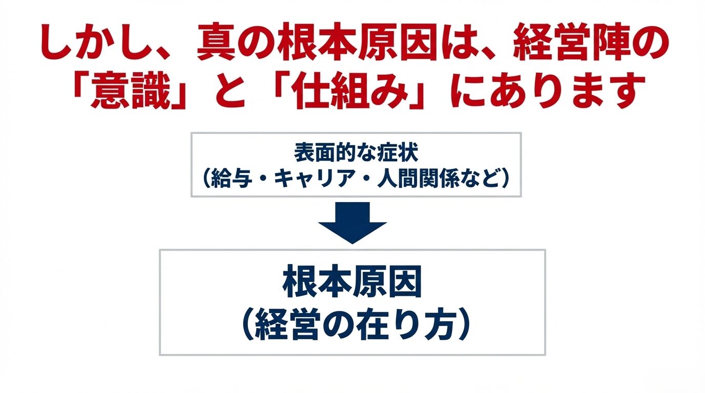 中堅社員が次々に辞める企業には、キャリアパスの曖昧さやトップダウン型マネジメントの弊害、公正さを欠く評価制度、そしてコミュニケーション不足など、様々な要因が複合的に絡み合っています。しかし、これらは単なる「表面的な事象」にすぎず、その奥には「経営者と社員の価値観ギャップ」「組織開発や人材育成の後回し」「管理職のマネジメント力不足」といった「真の理由」が潜んでいるものです。
