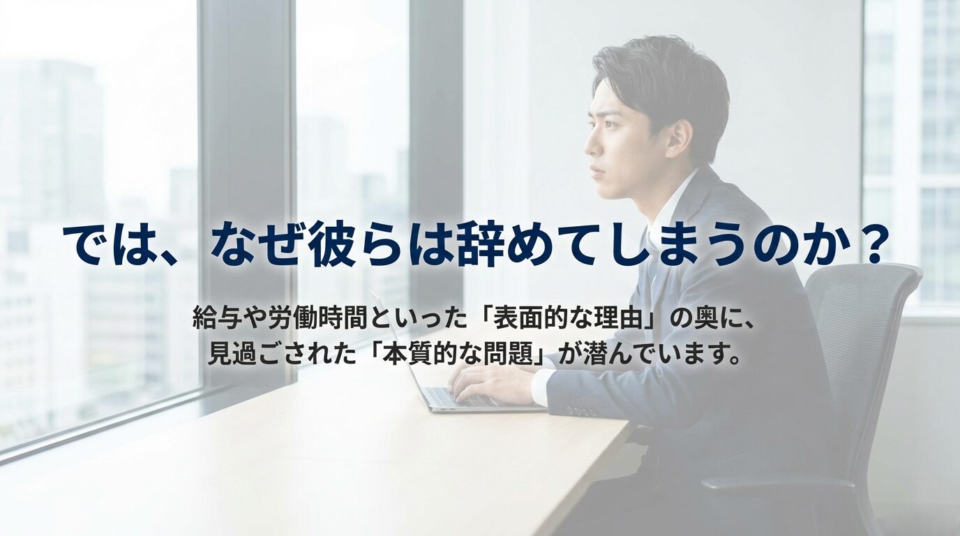 退職理由を確認すると、「給与が低い」「労働時間が長い」「上司と合わない」等の理由がよく挙げられるのですが、実はそれだけでは説明しきれない、より根本的な原因が存在します。