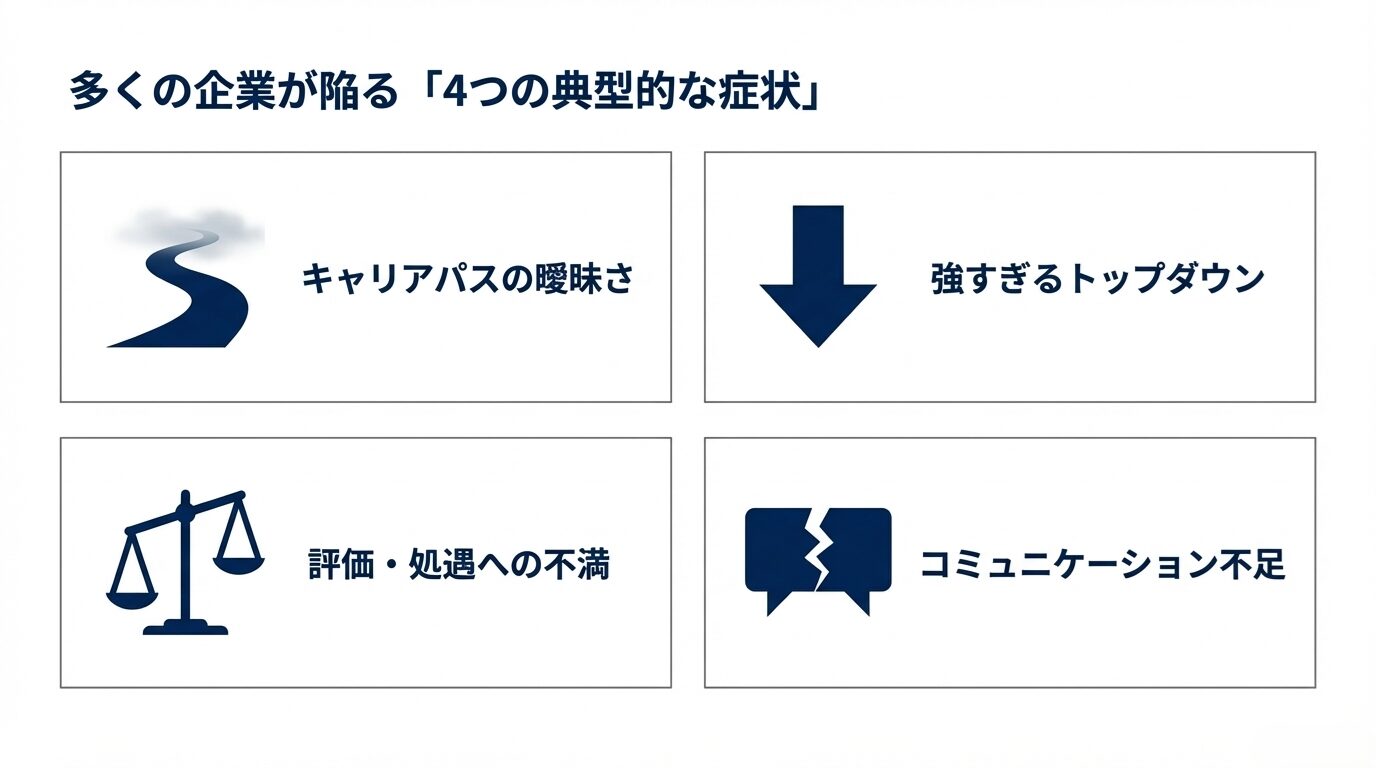 - 「年功序列的な昇給はもう期待できない」と本人が感じる一方で、実力を評価する明確な仕組みも整備されていない