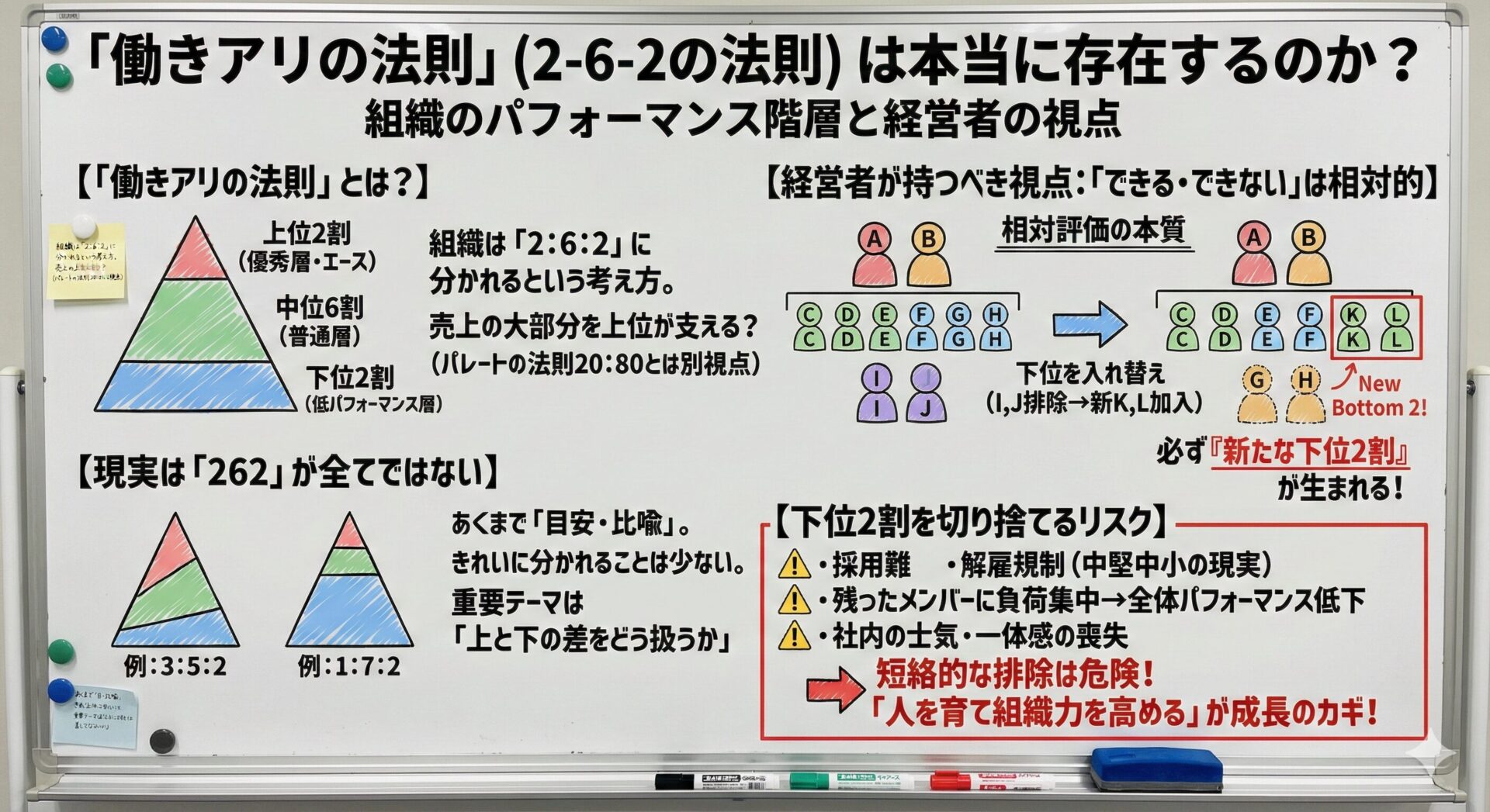 こうしたリスクを考えると、単純に「下位2割を排除すればOK」という発想は、現実的かつ長期的な経営戦略としては危険です。特に中堅中小企業では、「人を育てながら組織力を高める」ことこそが成長のカギになるケースが多いといえます。