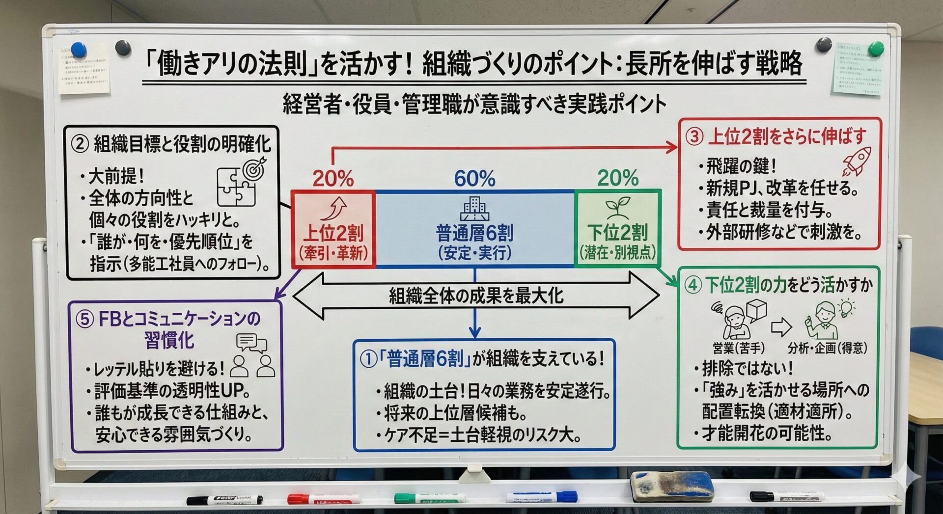 組織づくりにおいては、「できない部分の改善」にばかり注目してしまいがちですが、「できる部分をどう伸ばすか」という発想を同時に持つことで、全体のパフォーマンスを大きく底上げできます。特に中堅中小企業の場合、大企業にはない「意思決定のスピード」や「柔軟性」が強みになることもしばしばです。上位2割、普通層6割、下位2割、それぞれが適材適所で活躍できる仕組みを整え、組織全体が相乗効果を生み出す形を目指してみてください。人材不足と言われる時代だからこそ、一人ひとりの強みを最大限に活かすマネジメントが大きな成果につながるはずです。