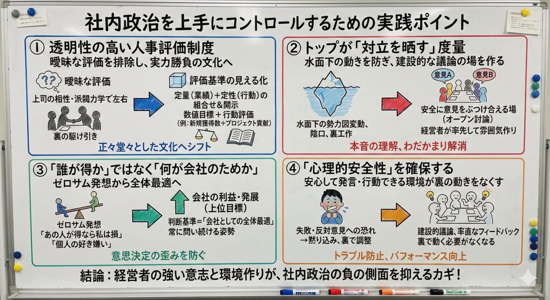 対立そのものは悪ではありません。むしろ建設的な意見交換は企業の成長に不可欠です。大事なのは、対立が表に出ず陰口や裏工作に発展することを防ぎ、オープンな議論の場で解決できるようにすることです。そして何より、経営者が率先してその雰囲気をつくることが、社内政治の負の側面を抑える重要なカギとなるのです。