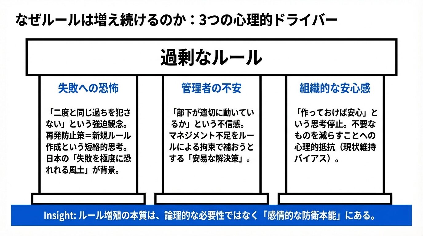 - 失敗や責任を恐れる心理が、過剰なルールを生む