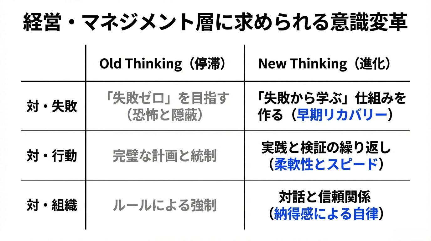 経営者・管理職が「絶対に失敗を許さない」という姿勢を持っていると、部下や社員は恐怖を感じ、余計にルールで縛る方向へ向かわせてしまいます。失敗はリスクであると同時に「学びの機会」でもあります。トラブルやミスが起こるのは当然であり、それを最小限にとどめ、早期にリカバリーする仕組みづくりのほうが重要です。「失敗をゼロにする」のではなく、「失敗からどれだけ学ぶか?」を重視する風土を醸成しましょう。