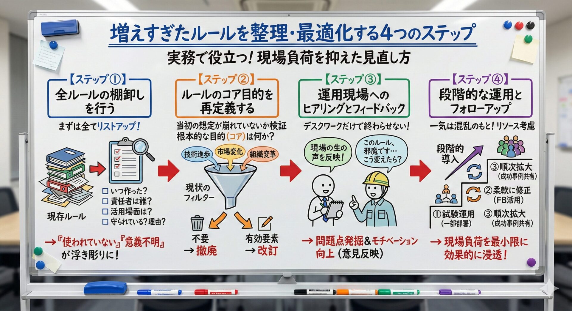 このようなステップを踏むことで、現場負荷を最小限に抑えながら効果的にルールを浸透させられます。
