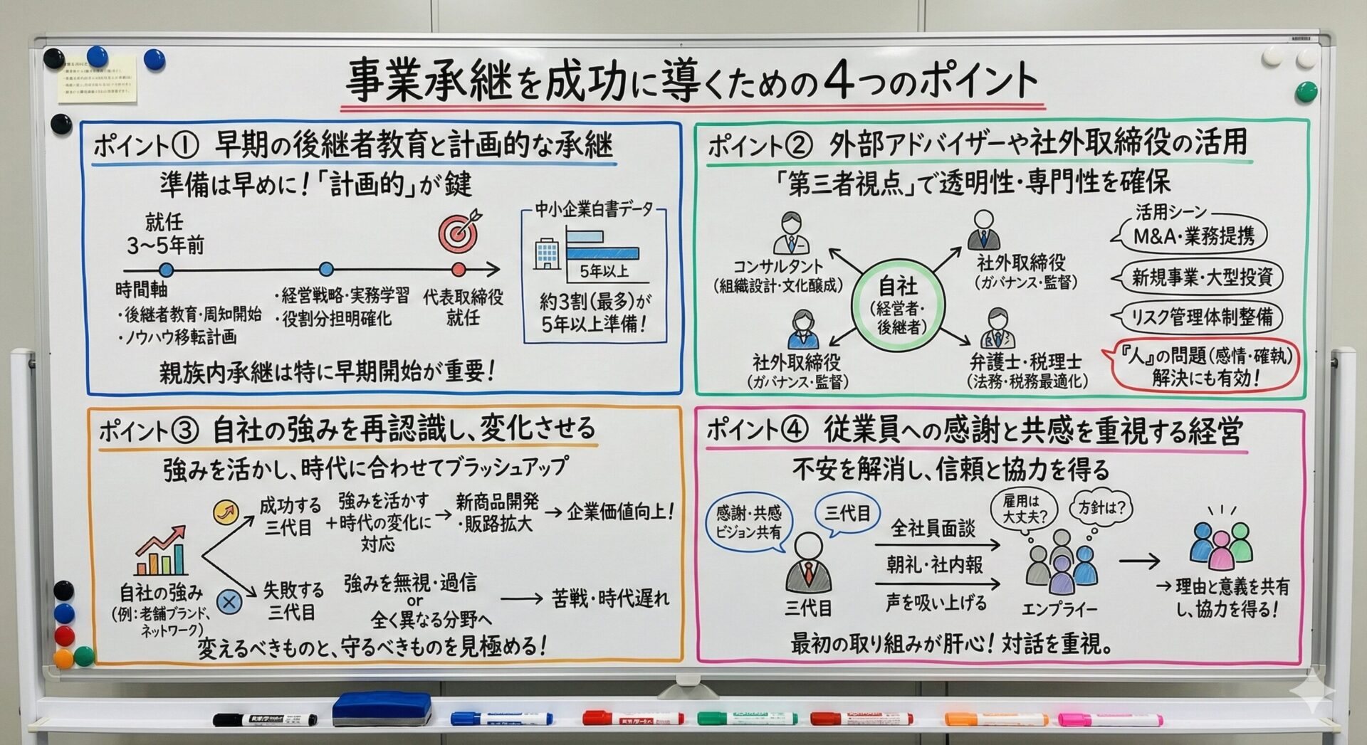 成功する三代目は学習意欲が高く、経営セミナーや異業種交流会、最新の経営手法やITツールの研究などを積極的に行います。あるいは外部から専門家やコンサルタントを招き、自分の弱点や客観的な課題を把握し、組織全体の成長に活かそうとします。こうした「柔軟な学びの姿勢」が会社を取り巻く環境の変化に対応し、事業の長期的な発展につながるのです。