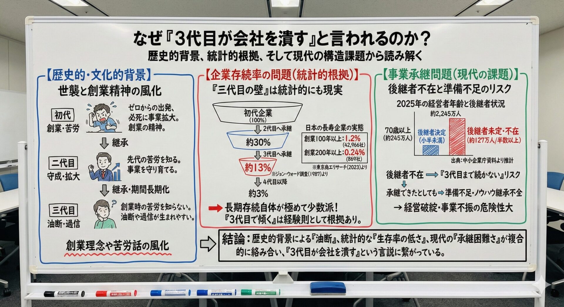 「創業者は苦労して会社を創り上げ、二代目はビジネスを安定させ、三代目で事業が傾く」――そんな話を耳にしたことがある方ももしかするといらっしゃるかもしれません。