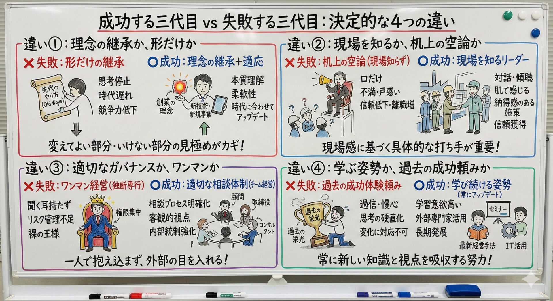 では、「成功する3代目」と「失敗する3代目」では、何が違うのでしょうか?本章では4つの違いについて説明していきます。