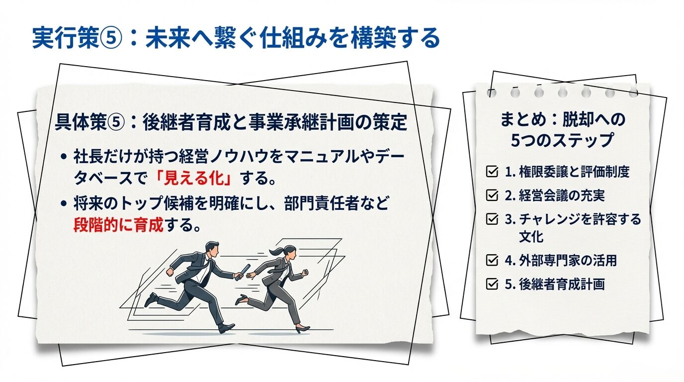 社長だけが握っている情報を、幹部や管理職へ体系的に共有する仕組み(マニュアル、データベースなど)をつくる。 - 将来のトップ候補を明確にし、段階的に育成