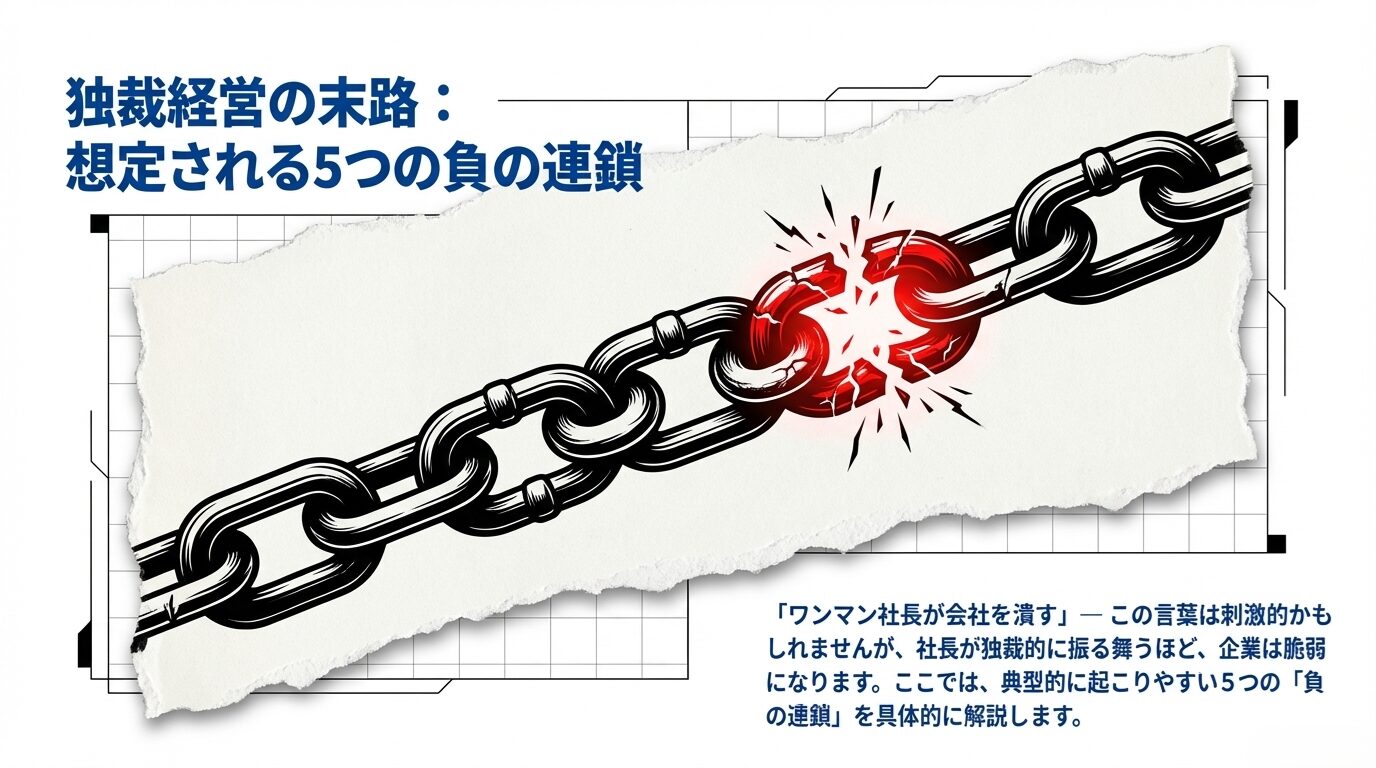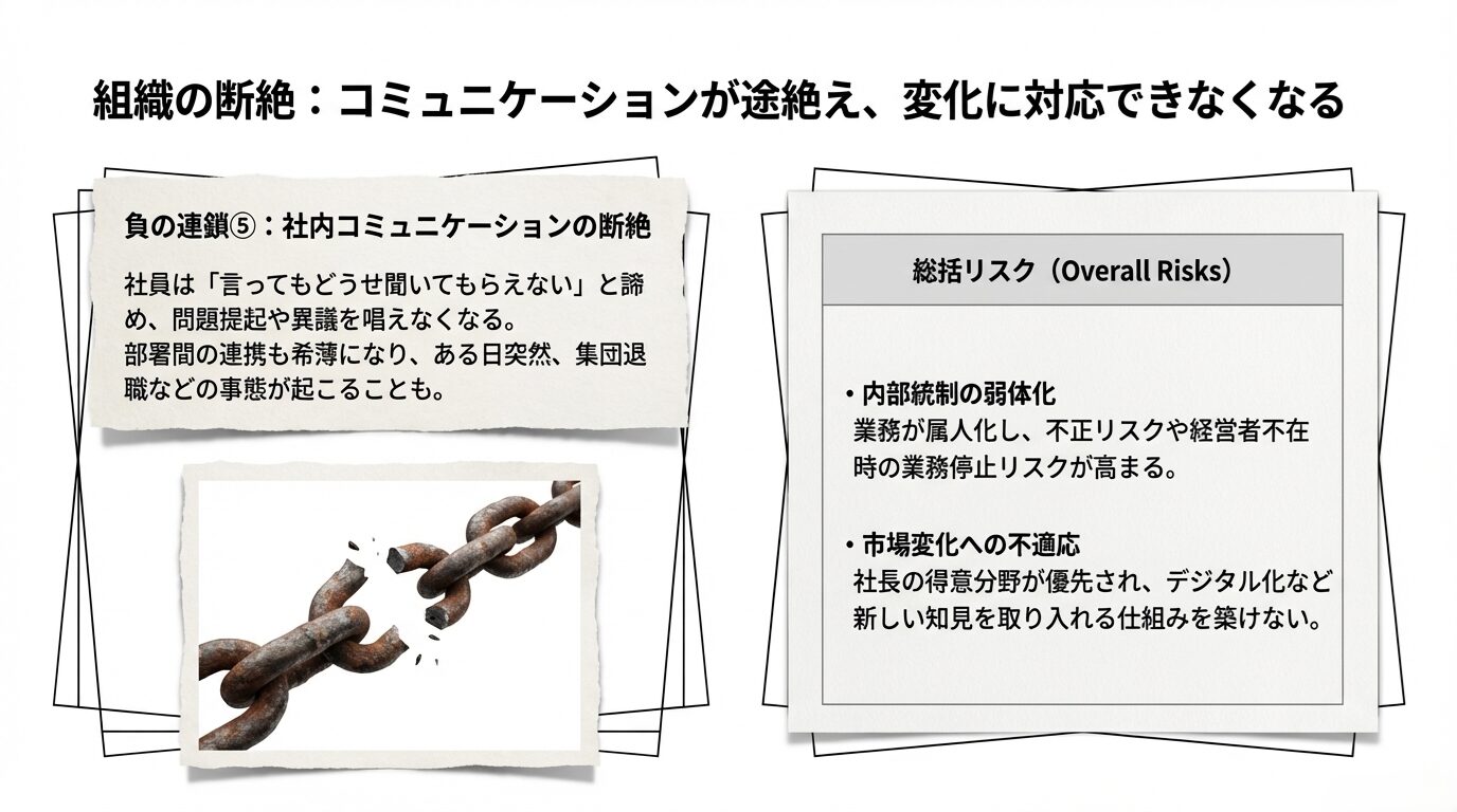 チェック機能が働かない中での独断的な資金調達や設備投資は、一度の失敗で会社を傾かせます。誰かが「それは危険です」と言える環境がないことが、致命傷となるのです。