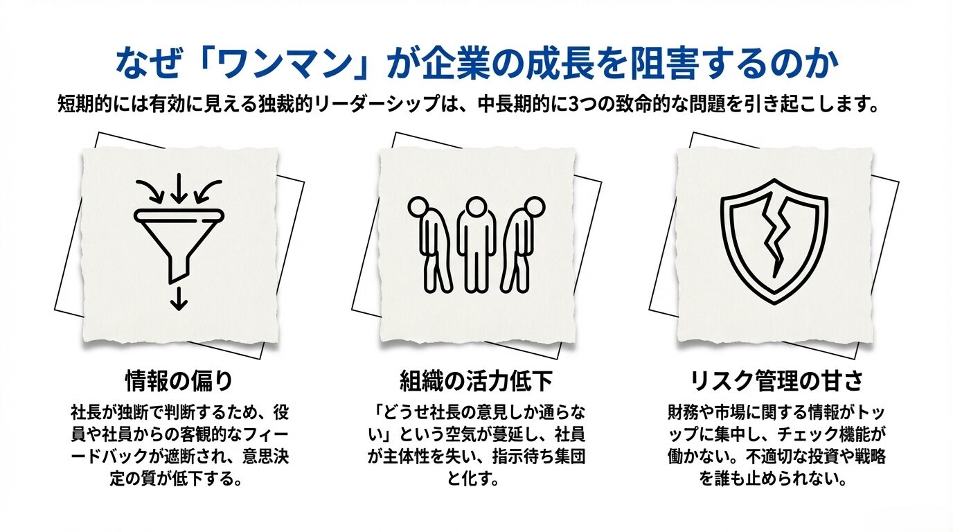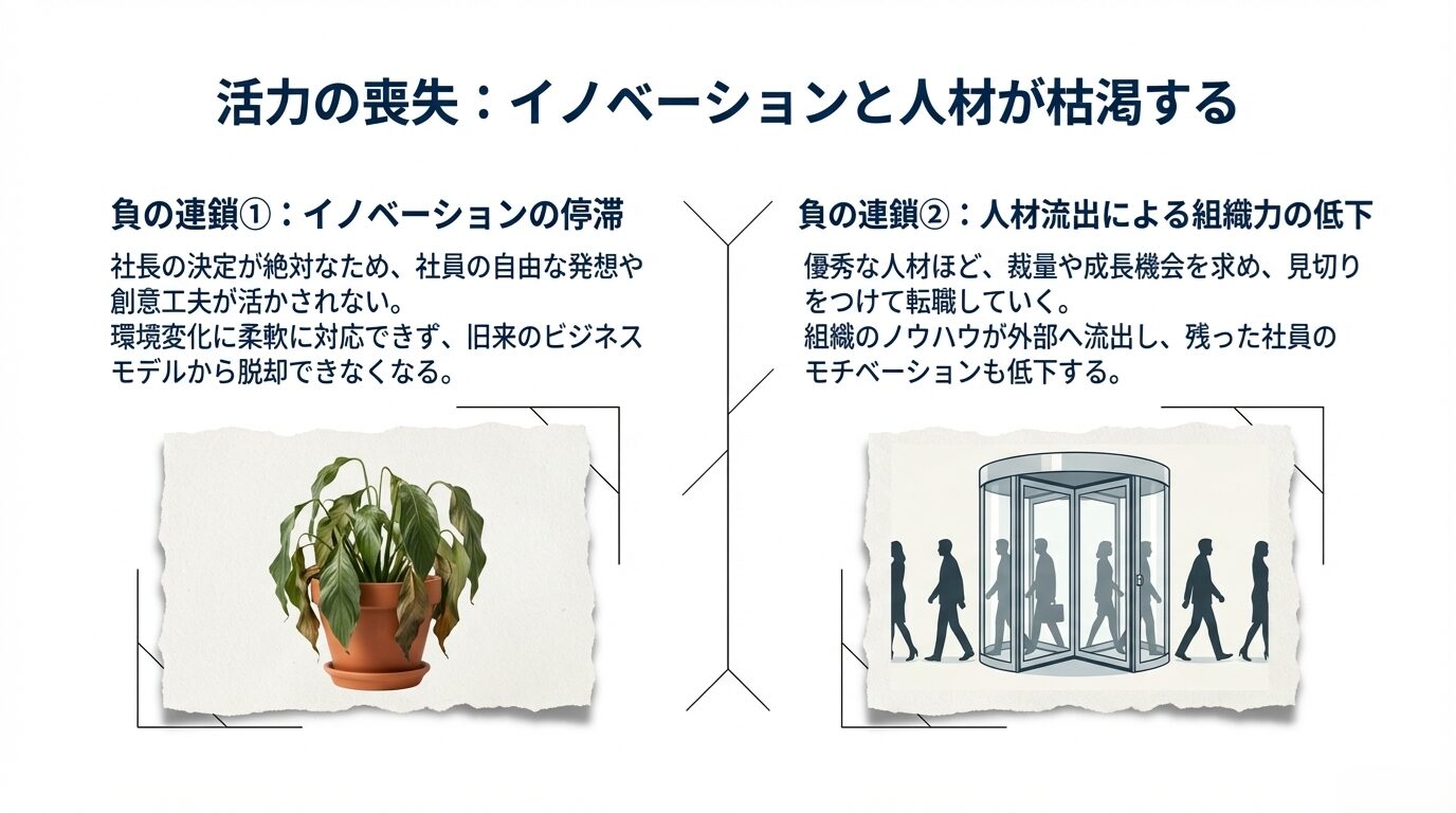 社長が一方的に情報を集め、かつ最終判断を独断で下すため、他の役員や社員からの客観的なフィードバックが反映されにくくなります。 - 組織の活力低下