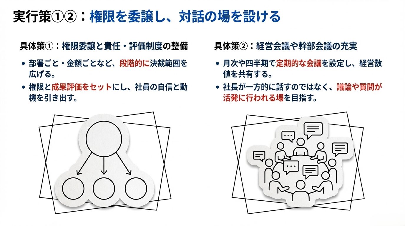 - 権限委譲マトリクスや会議体の整備など、具体的な「仕組み」で脱却を図る