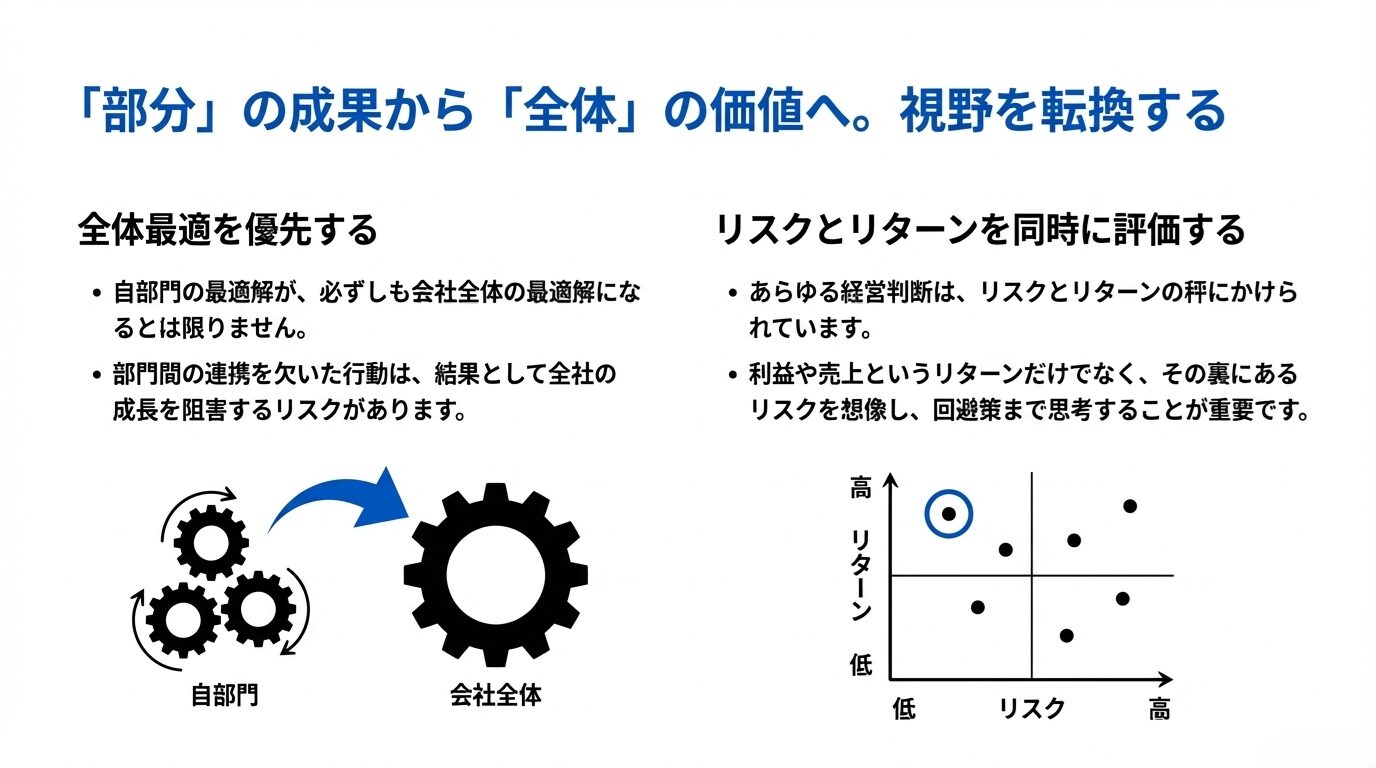 「経営者目線」を理解するうえで鍵になるのが、全体最適を優先する視点です。例えばあるプロジェクトで、自部門の利益だけを最優先に考えれば、短期間での成果をひょっとすると出しやすいかもしれません。しかし会社全体で見た場合、別の部門や今後の投資計画などとの兼ね合いもあり、「自部門の最適解=会社全体の最適解」になるとは限らないのです。