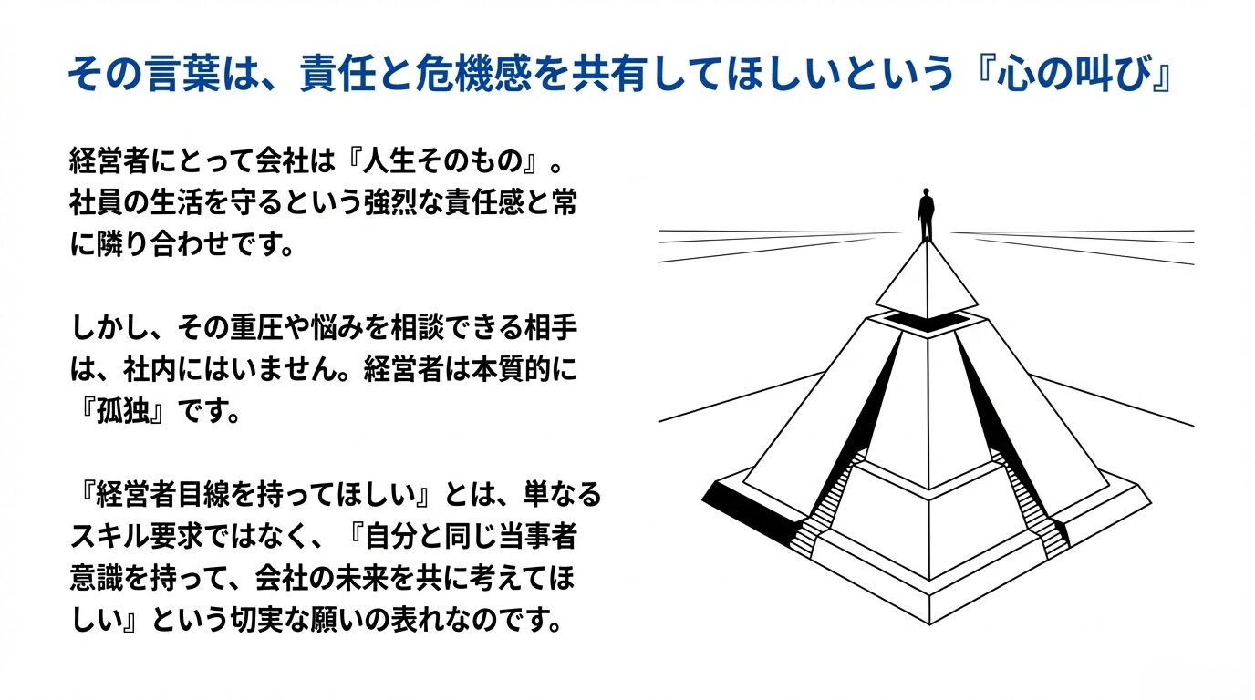 この危機感と責任感を共有し、その過程で起きる問題・悩みをすべて明かして相談できる人が実は経営者にはいません。経営者は常に「孤独」なのです。それゆえ、現場の社員に対して「経営者目線を持ってほしい」というのは、単に経営の数字に強くなってほしいということではありません。このような責任感・当事者意識を共有してほしいという「心の声」「心の叫び」が1つの形として表出化している側面がとても大きいと思うのです。