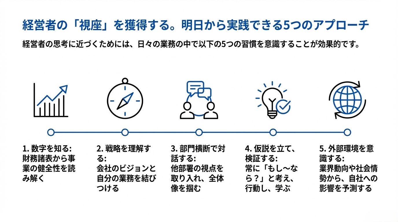 では、経営者目線を身につけるにはどうすればいいのでしょうか?本章では、具体的な5つのアプローチを見ていきましょう。