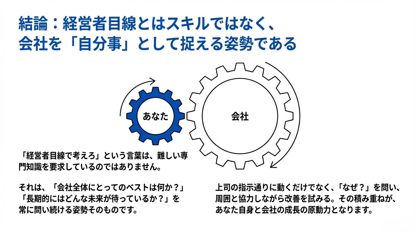 「経営者目線で考えろ」と言われると、何やら難しい専門知識が必要そうなイメージがあるかもしれません。しかし実際には、日常業務の延長線上にある「会社全体にとってのベストは何か?」「長期的にはどんなリスクやチャンスがあるのか?」を意識して行動することに他なりません。
