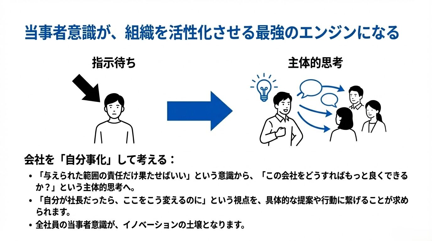 これは業務効率化のアイデアを出したり、新しいサービスの企画提案をするなどの行動にも表れます。もし社員全員が「自分が社長だったら、ここをこう変えるのに…」と思うだけでなく、積極的に提案していけば、社内は大きく活性化するでしょう。