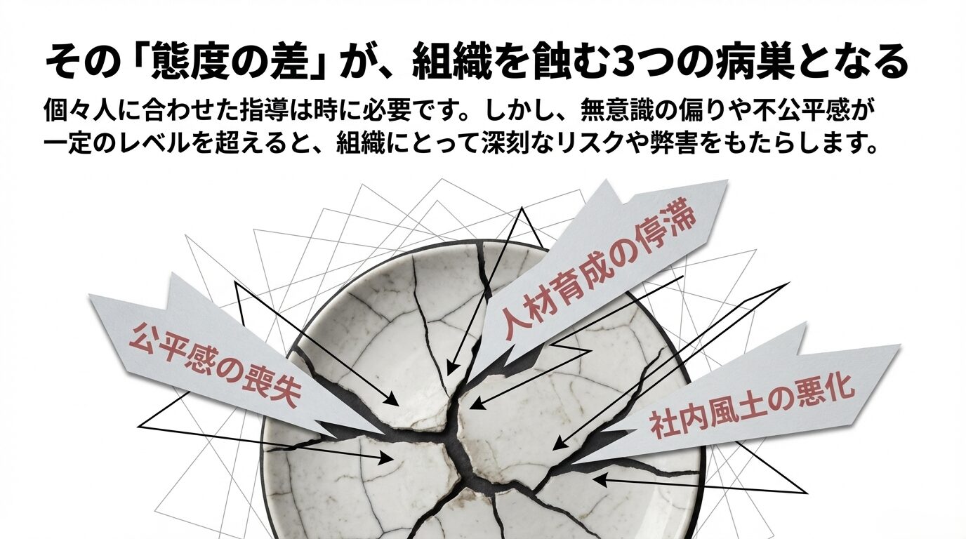 上司が部下に対して態度を変えることそのものが100%悪いとは私も思っていません。時には、指導方針や育成手段を個々人に合わせることが必要な場合もあり、ある程度の「差」はむしろ適切なリーダーシップの証でもあります。しかし、以下のような状態にまで及んでしまうと、組織にとっては深刻なリスクや弊害をもたらすため、注意が必要でしょう。