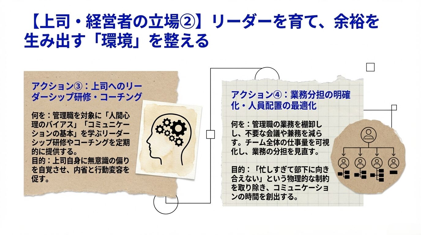 - コミュニケーション頻度を意図的に均す:苦手意識のある部下ほど意図的に話す機会を増やす。