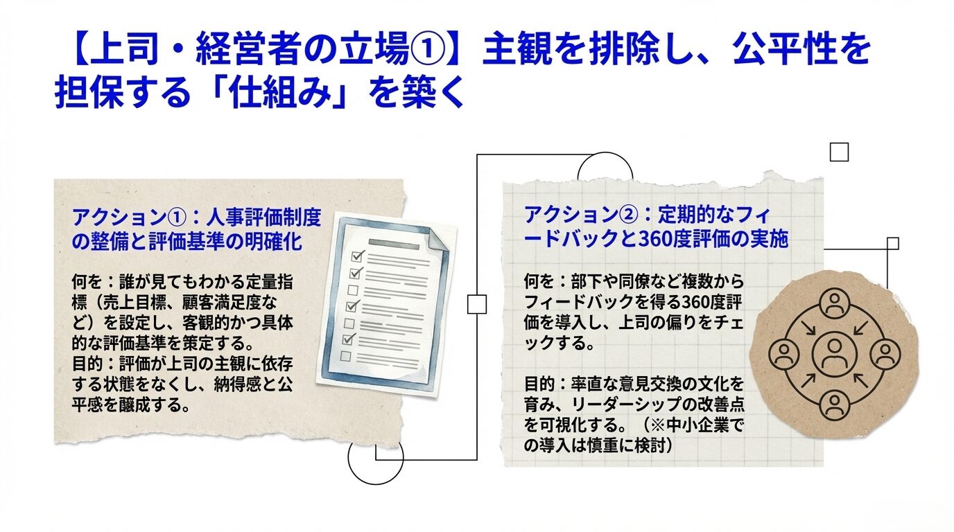 小さな組織でも、360度評価(上司、同僚、部下など複数のステークホルダーからフィードバックをもらう仕組み)を導入する企業もいます。全員が率直に意見を交わし合える文化が育まれれば、「上司が偏った態度を取っていないか」のチェックが自然になされます。