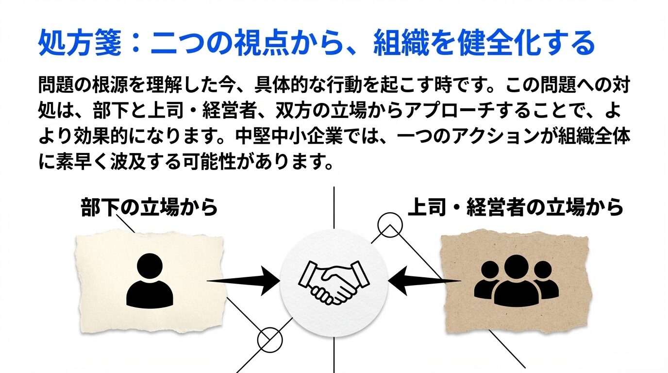 なお、対処法は「部下の立場での対処」と「上司・経営者の立場での対処」に分けて考える必要があります。中堅中小企業の場合、社内の人数が少ない分、対策を講じると即座に職場全体へ波及しやすいという利点があります。ぜひ可能なものから実行に移してみてください。