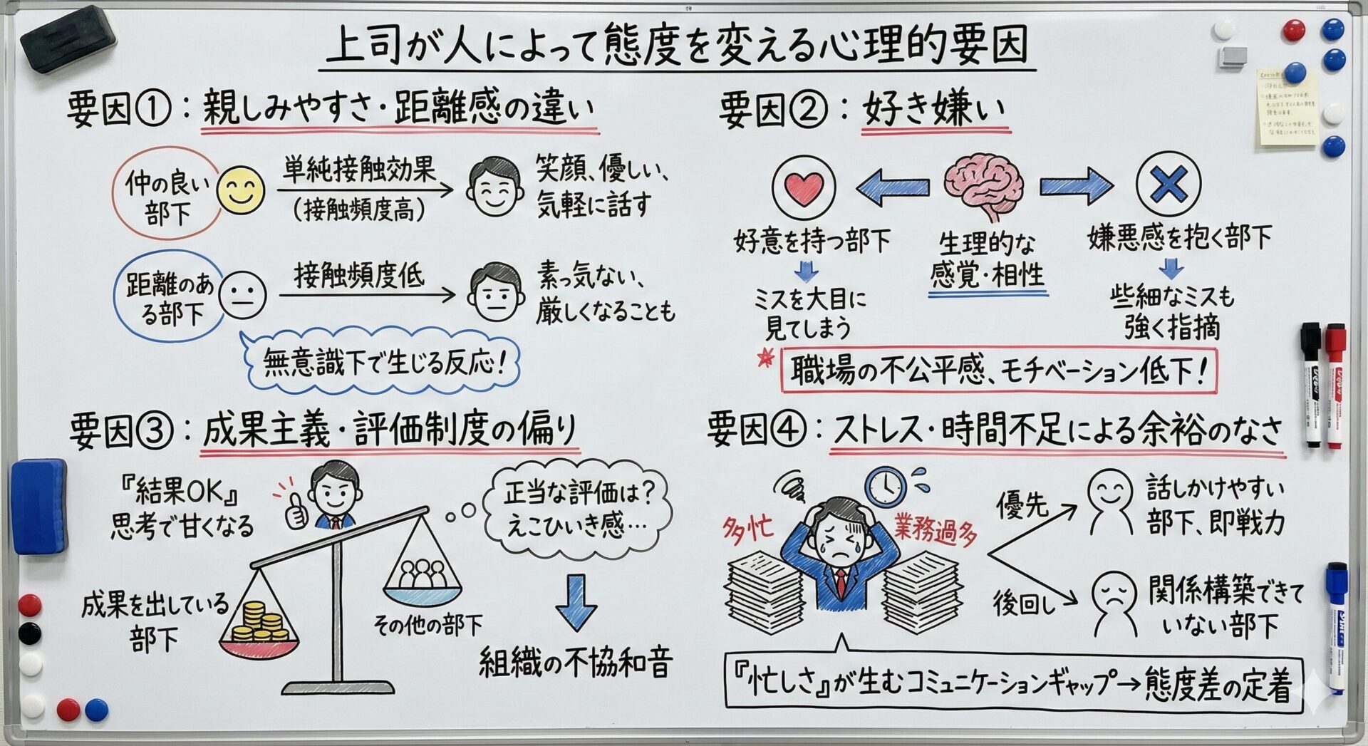 上司が部下によって態度を変えることには、心理的・制度的・環境的にさまざまな要因が絡んでいます。人間である以上、完全な平等を目指すのは現実的に困難な部分があるのも事実ですが、少なくとも「無意識な偏り」や「評価の曖昧さ」から生まれる不公平感は、組織に深刻なダメージを与えます。