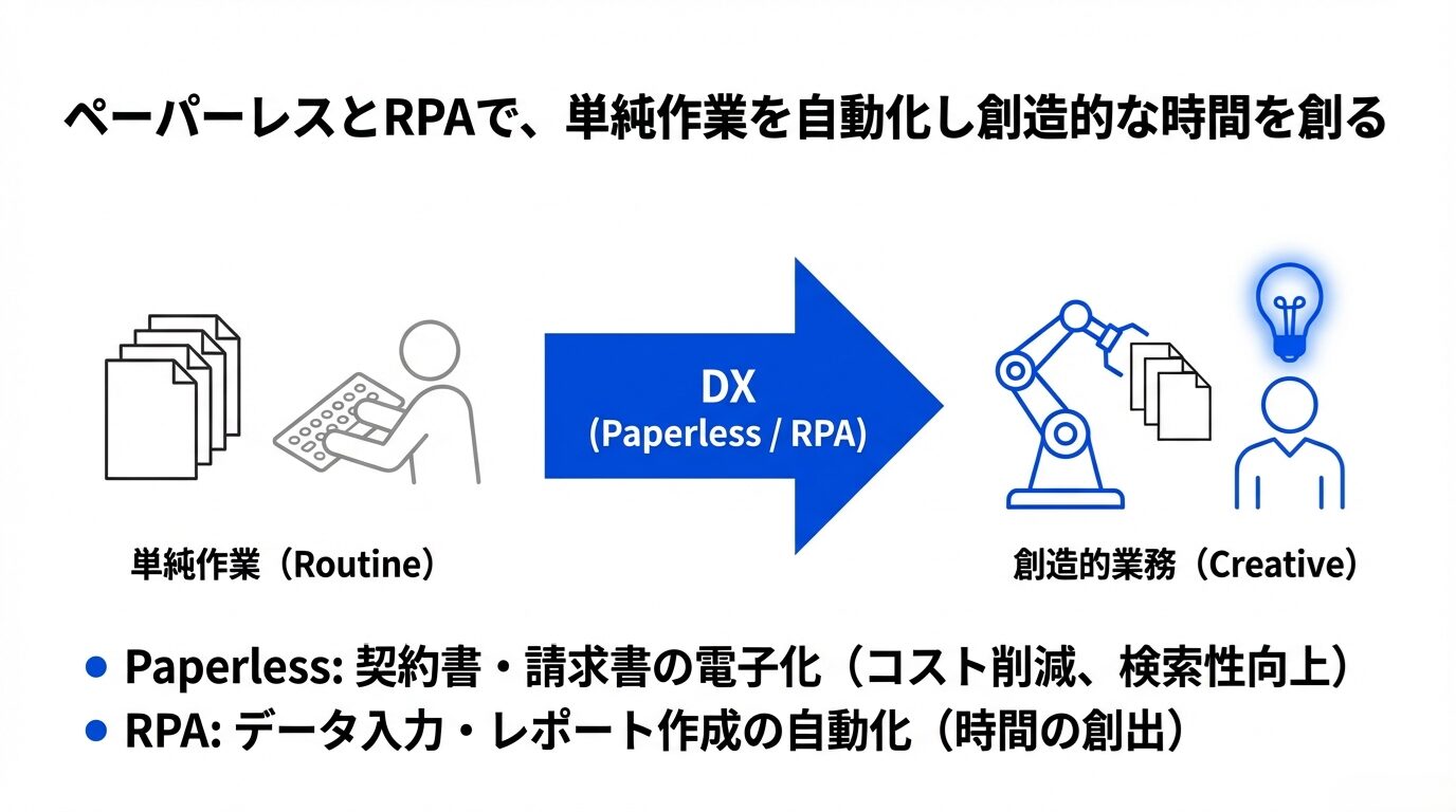 デジタル化を進めることで、手作業に頼らない効率的な業務運営が可能になります。まずは、ペーパーレス化から始めましょう。契約書や請求書を電子化することで、印刷や保管にかかるコストを削減できます。また、検索性が向上し、必要な情報をすぐに見つけられるようになります。ペーパレス化について詳細を知りたい方は、下記の記事をお読みください。