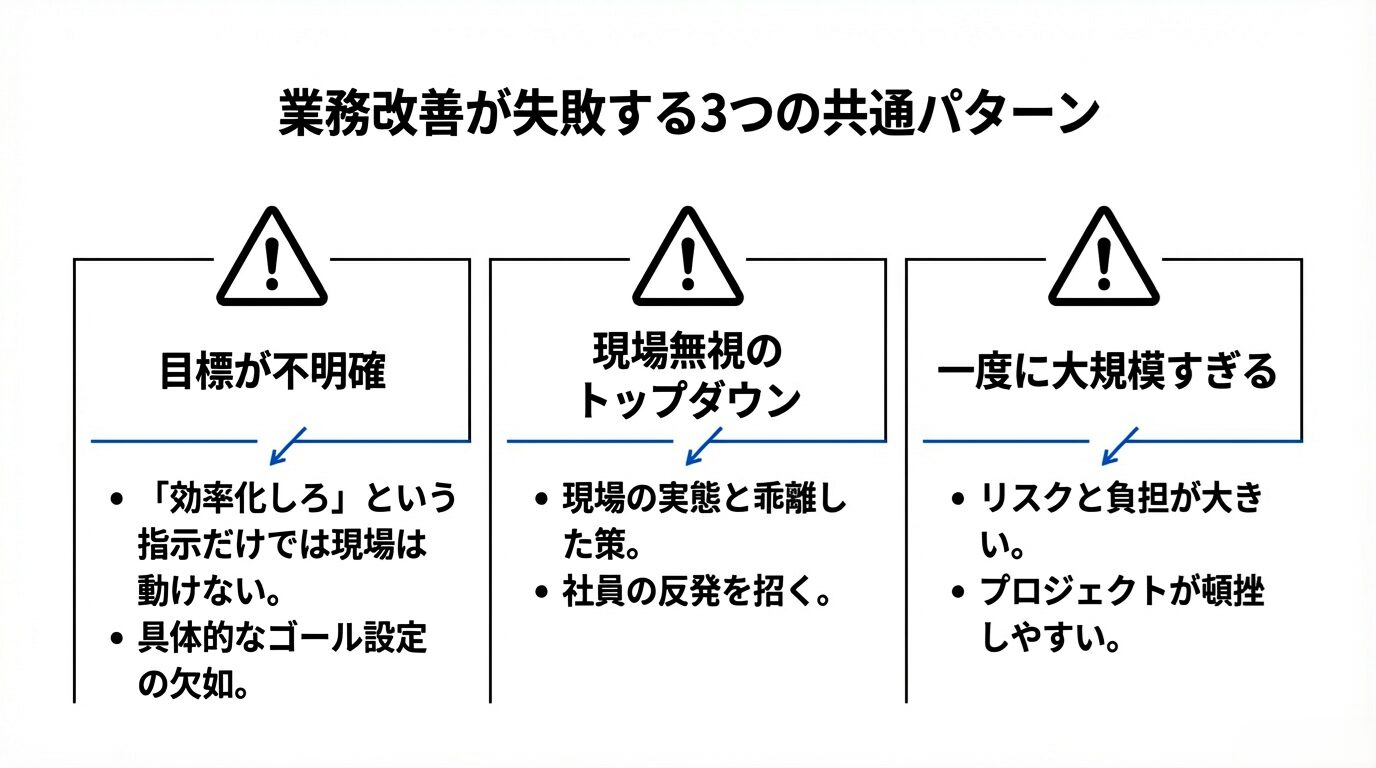 業務改善が失敗するケースには、いくつかの共通した特徴があります。まず、目標が不明確な場合です。「業務を効率化する」といった漠然とした目標では、社員が具体的に何を改善すれば良いのか分からず、結果的に取り組みが形骸化してしまいます。また、現場の声を無視してトップダウンで進めると、改善策が現実とかけ離れたものになり、社員の抵抗を招くことがあります。さらに、一度に大規模な改善を目指すと、リスクや負担が大きくなり、プロジェクト自体が頓挫する可能性があります。
