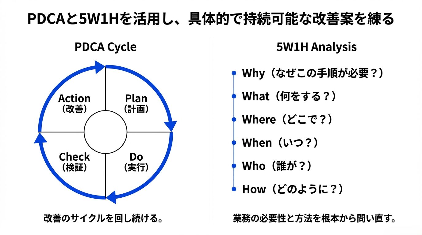現状分析を基に、どのように改善できるかを具体的に考えます。ここでは、PDCA(計画・実行・検証・改善)や5W1H(誰が、何を、どのように、なぜ)などのフレームワークを活用します。 - 改善策を実行し、効果を検証する