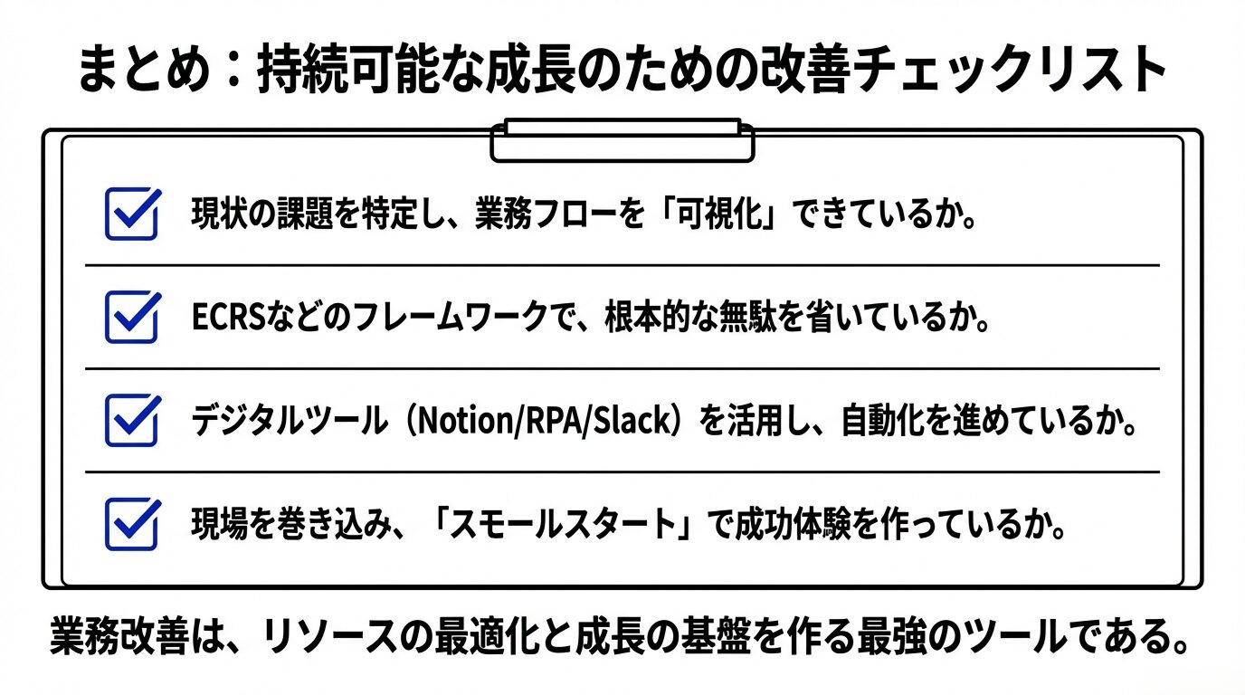 本記事では、業務改善の基本的な考え方から具体的なステップ、実践ツール、注意点、さらには成功事例までを詳しく解説しました。