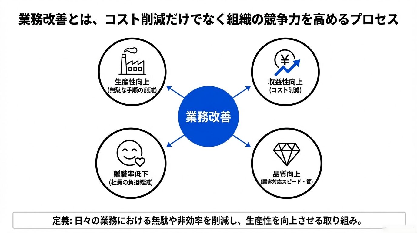 業務改善は、現状の業務プロセスを分析し、より効率的で効果的な形に再設計することを指します。その目的は、時間やコストの削減だけでなく、社員の働きやすさを向上させ、最終的には顧客満足度や会社の収益性を高めることです。具体的には、次のような成果を目指します。