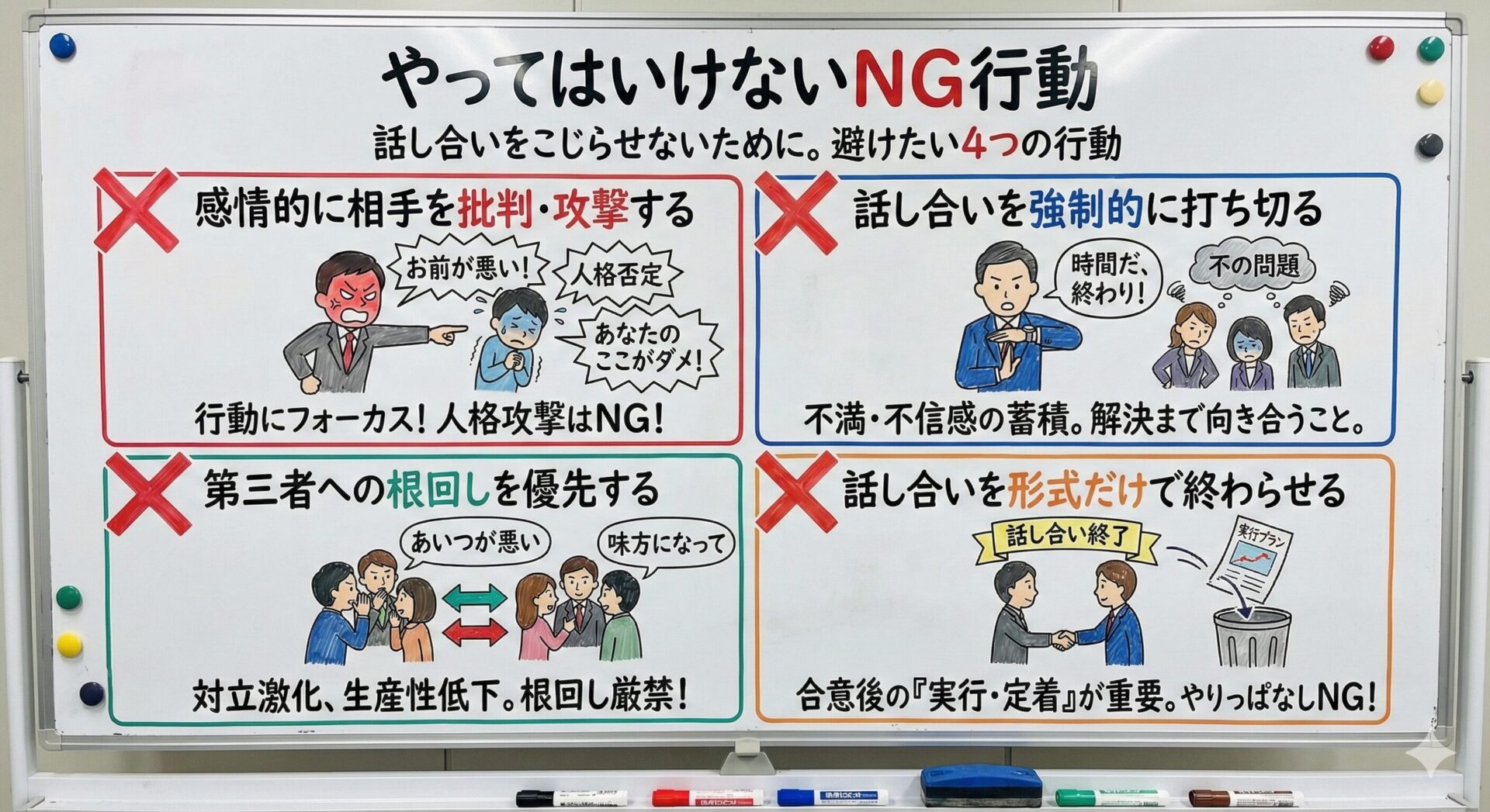 「どちらが正しいか」を周囲に訴え、味方を増やそうと画策するような行為は、対立の構図を明確化させ、収拾を難しくします。組織全体の生産性にも悪影響を及ぼすため、こうした根回し行為は厳禁です。 - 話し合いを形式だけで終わらせる