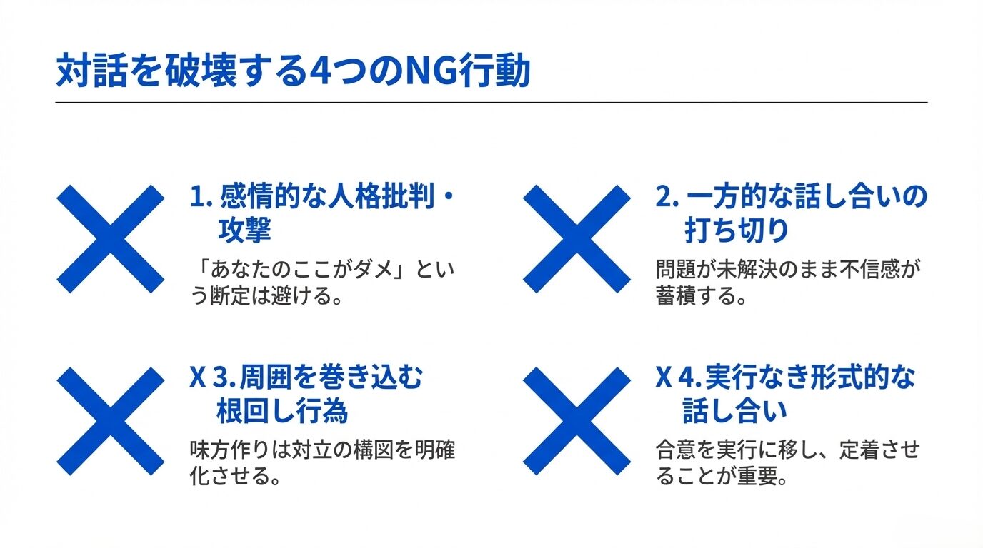 - 感情的な批判や一方的な打ち切り、形式的な話し合いだけで終わらせる行為はトラブルを悪化させる原因となる。