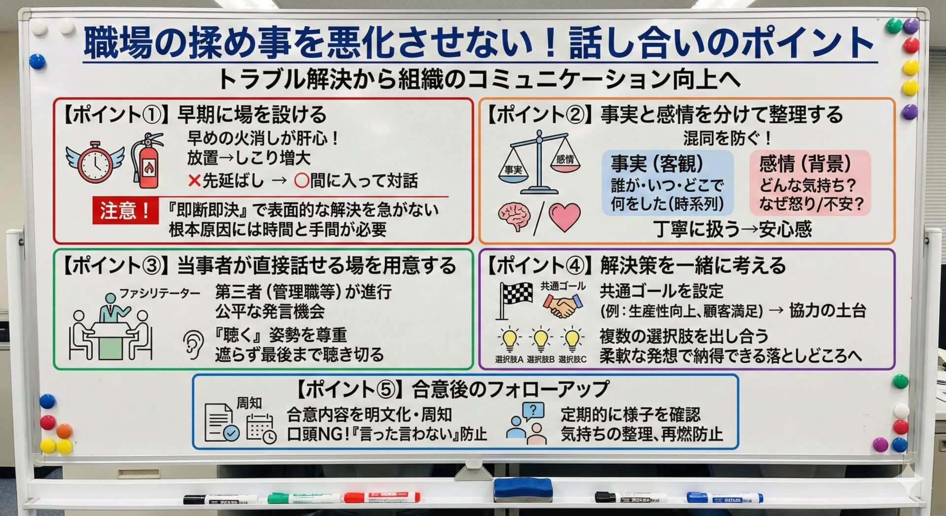 本コラムでお伝えしたように、職場の揉め事を悪化させないためには、以下のポイントを押さえることが重要です。