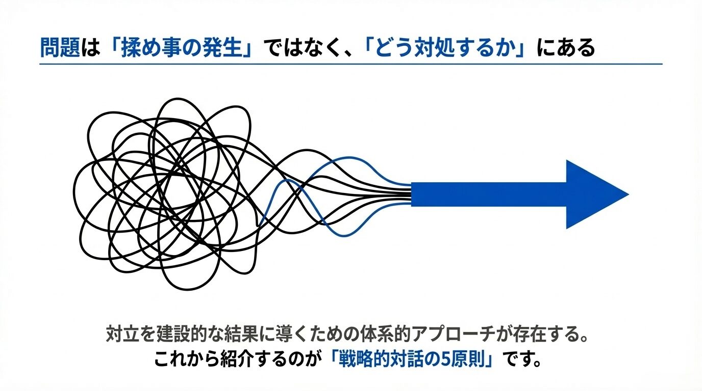 - 事実を冷静に把握しつつ、当事者の感情を丁寧に扱うことで、相互理解が深まり解決の糸口が見えてくる。