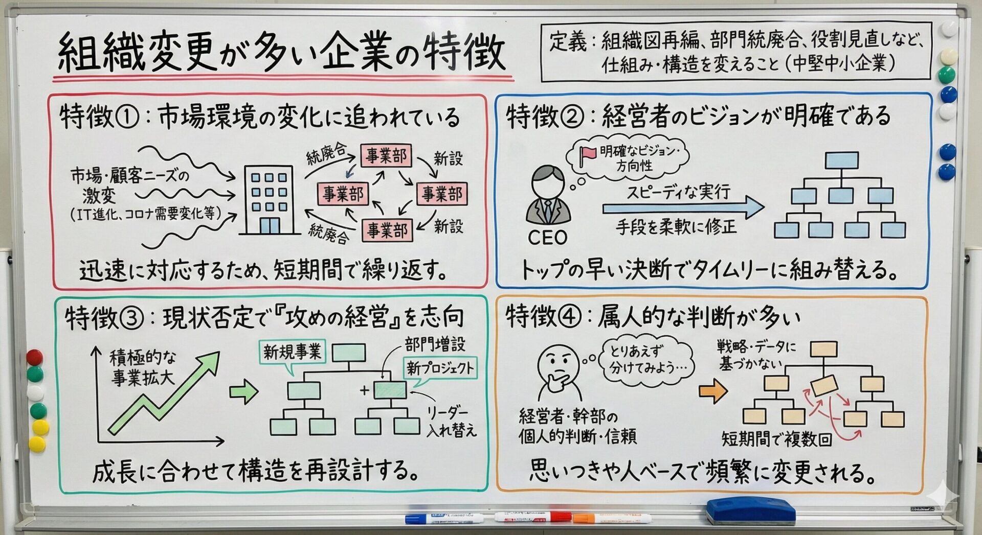 組織変更とは、組織図の再編成や事業部門の統廃合、役職名・責任範囲の見直しなど、会社の仕組みや構造を変えることを指します。中堅中小企業において組織変更を頻繁に行っている企業には、いくつか共通する特徴が見られます。